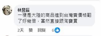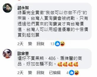 对此,不少台湾网友留言嘲讽:“绿营完全贯彻‘我做可以你做不行’的宗旨,台湾人买淘宝会被‘统战’,只有通过他们买来的淘宝货才有‘台湾价值’,台湾人可以用超值优惠的十倍价买到,超划算。”“一样是大陆的商品进到台湾卖,价格翻了好几倍,当然直接跟淘宝买。”“每次看到这几个人,真心觉得台湾人活该,自己挑一堆这种‘咖’当民代。”“超符合党性的,从党外时期他们就最爱用信息落差来操作,现在用来发财当然一点都不为过”……