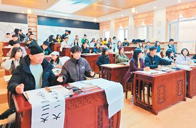 图为两岸青年学子一起在新疆师范大学学写书法。
