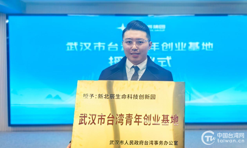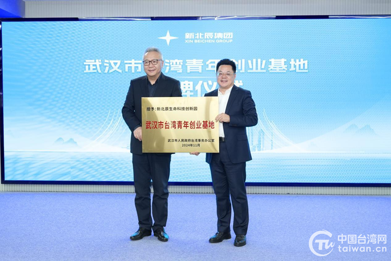 武汉市台办主任刘红鸣为新北辰台湾青年生命科技众创空间授牌。(中国台湾网发)
