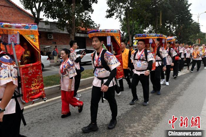 中新社泉州11月20日电 (记者 孙虹)背负神像、身着汉服、徒步前行……逾120名两岸青年20日从福建泉州晋江东石天后宫出发,开启一场集民俗、交流、学习于一体的寻根之旅。