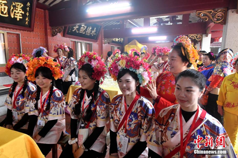 11月21日,两岸青年在泉州蟳埔顺济宫体验簪花。