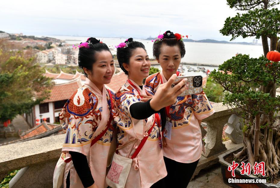11月25日,福建湄洲岛,台青赖妍宇(左)、王湘绫(中)、杨静妤梳完湄洲妈祖头饰后自拍。