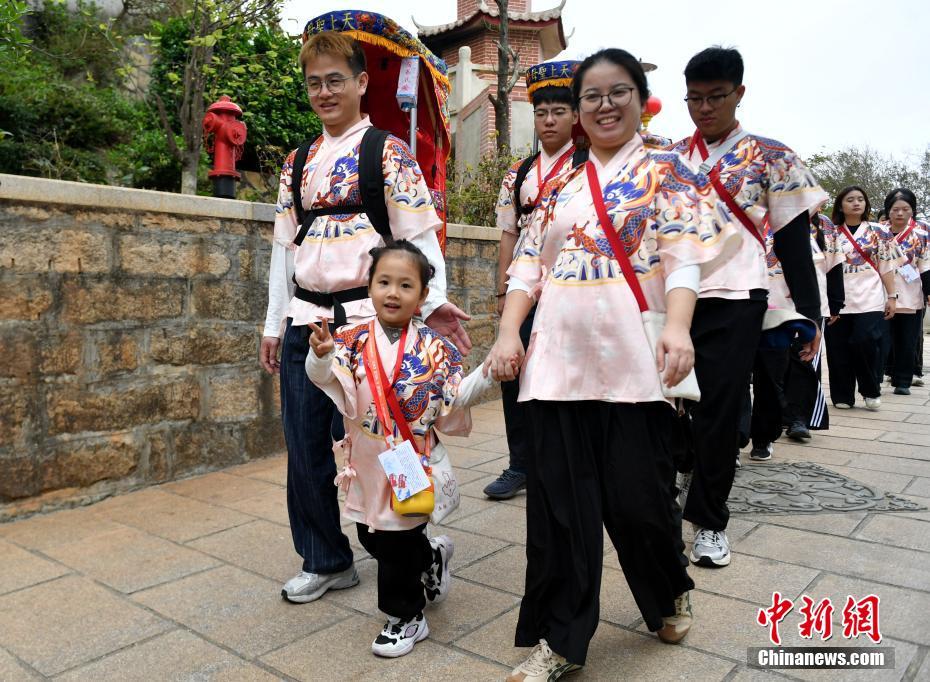 背负神像、身着汉服、徒步前行……逾120名两岸青年20日自泉州晋江东石天后宫出发,途经泉郡天后宫、蟳埔顺济宫等35座妈祖宫庙,横跨泉州、莆田两市的11个区,开启一场集民俗、交流、学习于一体的寻根之旅。由一瓣香妈祖文化展览馆和台湾台中偃月宫携手举办的第三届“瓣香牵两岸·徒步循初心”暨泉台青年妈祖文化周活动吸引两岸70间妈祖宫庙参与。其间,两岸青年徒步200多公里并于11月24日抵达“妈祖故里”莆田湄洲岛一同谒祖进香,沿途感受世界文化遗产魅力,参与两岸青年文化交流沙龙,共同传承和弘扬“立德、行善、大爱”的妈祖精神。图为11月25日,两岸青年从福建湄洲妈祖祖庙返程。