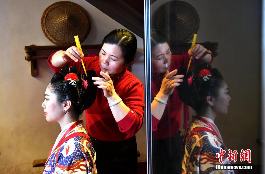 11月25日,台青王湘绫在福建湄洲妈祖祖庙体验梳妈祖头。