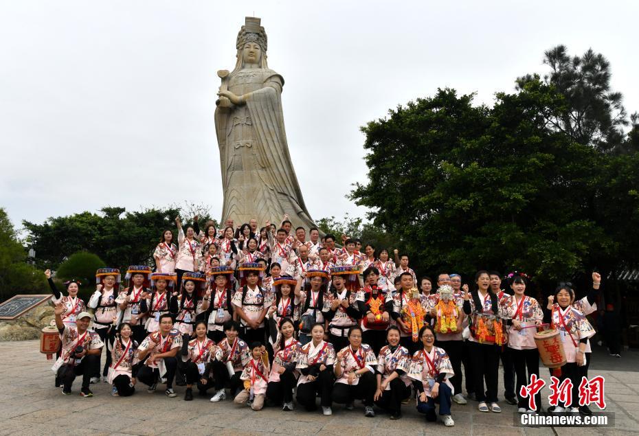 11月25日,两岸青年在福建湄洲妈祖石雕像前合影。