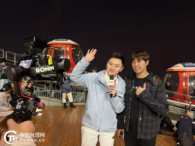 中国台湾网主持人与台湾自媒体博主在广州塔互动拍摄。(中国台湾网记者 刘琳 摄)