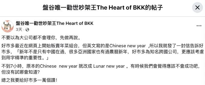 该事件缘起于一位名为“盘谷唯一劝世吵架王The Heart of BKK”的台湾网红,于12月13日在网络上发帖表示,好市多最近在网页上开始贩卖年菜组合,但英文写的是“Chinese New Year”,于是他决定发一封信告诉好市多,“新年不是只有中国在过,很多亚洲国家也有过农历新年,好市多为知名跨国公司,更应该考虑到用字精准的重要性。”