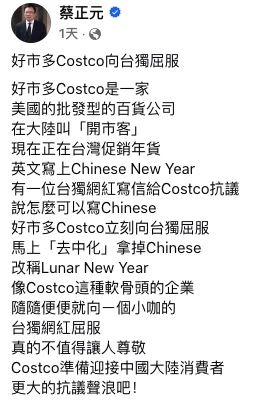 对于此次“Chinese New Year”改为“Lunar New Year”,不少台湾知名人士也发表看法。台湾立法机构前民意代表蔡正元发帖指,好市多向“台独”屈服,真的不值得让人尊敬,并认为只凭一个小咖的“台独”网红抗议,就把中国新年“Chinese New Year”改成“Lunar New Year”,是无知加愚蠢的做法。