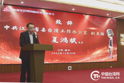 夏鸿斌在致辞中表示,赣州是江西承接沿海特别是粤港澳大湾区产业转移的重要城市,在深化江西与台湾交流合作方面发挥了重要作用。江西与台湾合作基础好、空间广、潜力大,全省台办系统将持续优化涉台营商环境,用心用情用力服务台胞台商台企,大力支持在赣台企深耕江西、做优做强。希望赣州市台协继续发挥桥梁纽带作用,积极参与两岸交流合作,带动更多台胞台商做中国式现代化的见证者、建设者和获益者。