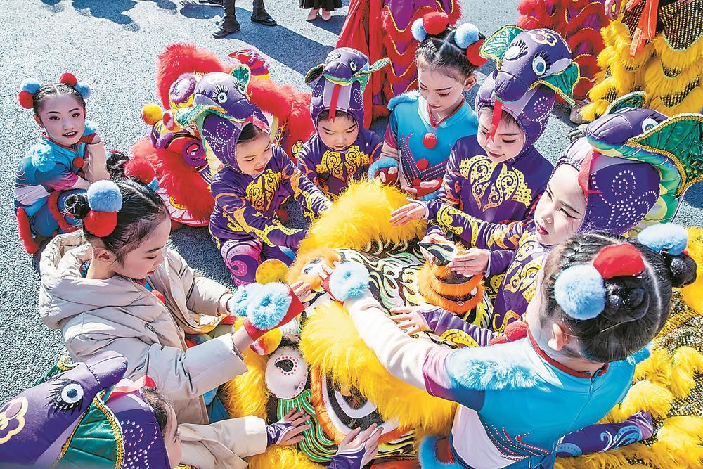 演出间隙,许多参演的小朋友在感受醒狮狮头的可爱。