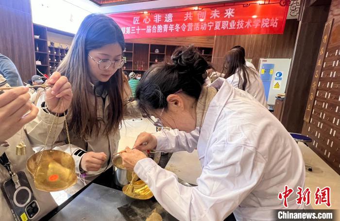 中新网银川2月18日电 (杨迪 徐英凡)17日下午,参与全国台联第三十一届台胞青年冬令营宁夏分营的40余名台胞走进宁夏职业技术学院,开启一场非遗手工的沉浸式体验之旅。