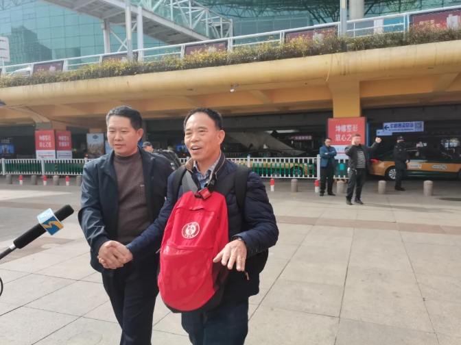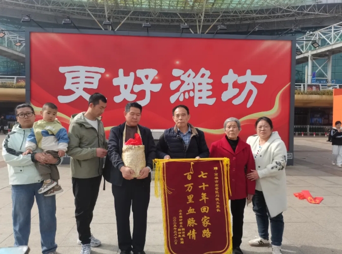 3月12日,在潍坊火车站出站口,50岁的潍坊市民鞠治良双手紧握于身前,表情凝重,望着一波又一波出站的旅客。当他在人群中看到了期盼已久的人,眼睛里顿时有了光,向对方使劲挥动着手。顺着鞠治良的目光望去,被称为老兵“灵魂摆渡人”的刘德文迎面而来,这次他带着鞠治良爷爷鞠荣国的骨灰跨越海峡,从台湾送回到了潍坊。