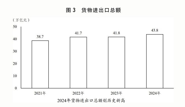 (六)加快建设更高水平开放型经济新体制,高水平对外开放取得积极成效。全年货物进出口总额43.8万亿元,服务进出口总额7.5万亿元,外商直接投资1162亿美元,境外直接投资1438亿美元。年末外汇储备规模达32024亿美元。