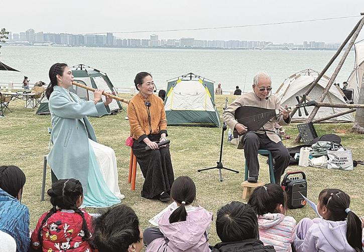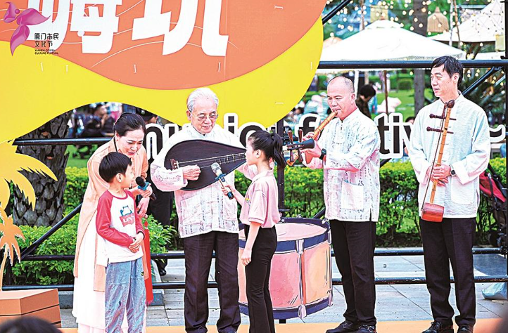 2024年5月2日,卓圣翔在厦门市海湾公园参加市民文化节并与现场儿童观众互动,推广普及南音。