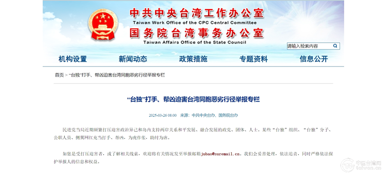 国台办官网开设“‘台独’打手、帮凶迫害台湾同胞恶劣行径举报专栏”