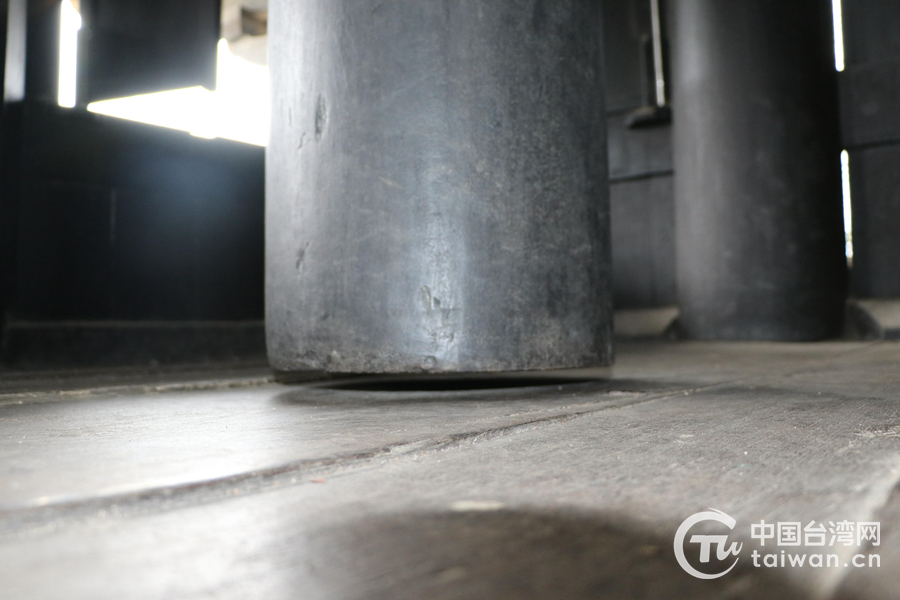 真武阁二楼的四根立柱悬空于地面。(中国台湾网记者 李宁 摄)