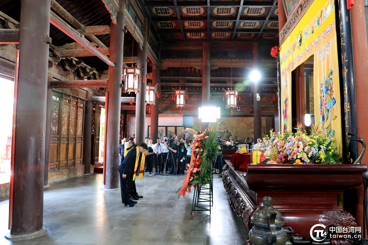 马英九同宋涛进入伏羲庙,拜谒祖庙,敬献花篮,寄托追思与尊崇之情。(中国台湾网记者 尹赛楠 摄)