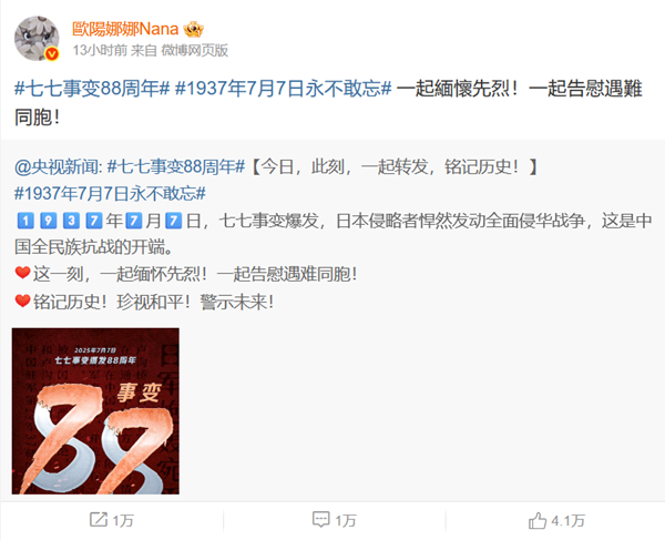 台湾艺人欧阳娜娜也在今天转发央视新闻的贴文“勿忘国耻,吾辈自强”,并附文“一起缅怀先烈!一起告慰遇难同胞!”。(编辑/文方)