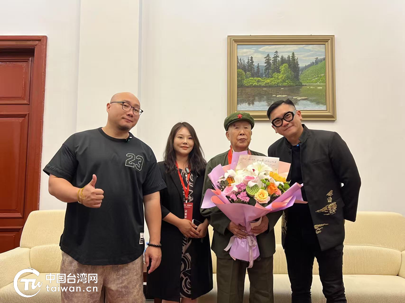台湾青年自媒体人与抗联战士王济堂合影。(中国台湾网记者 刘琳 摄)