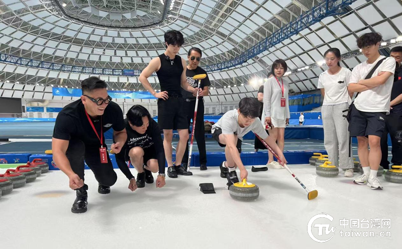 台湾青年自媒体博主向运动员学习冰壶发球姿势。(中国台湾网记者 刘琳 摄)