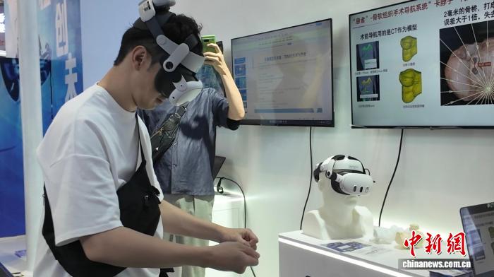 从创意生成到落地应用,人工智能领域不乏两岸携手的身影。走进艾生智慧(北京)医疗科技有限公司的展示区,观众戴上AR眼镜,瞬间从现实世界切换至虚拟手术台。试着在工具台上抓握手术刀,化身一位骨科医生。该眼镜搭载精准导航技术,应用在骨科手术领域,可有效减少误差。