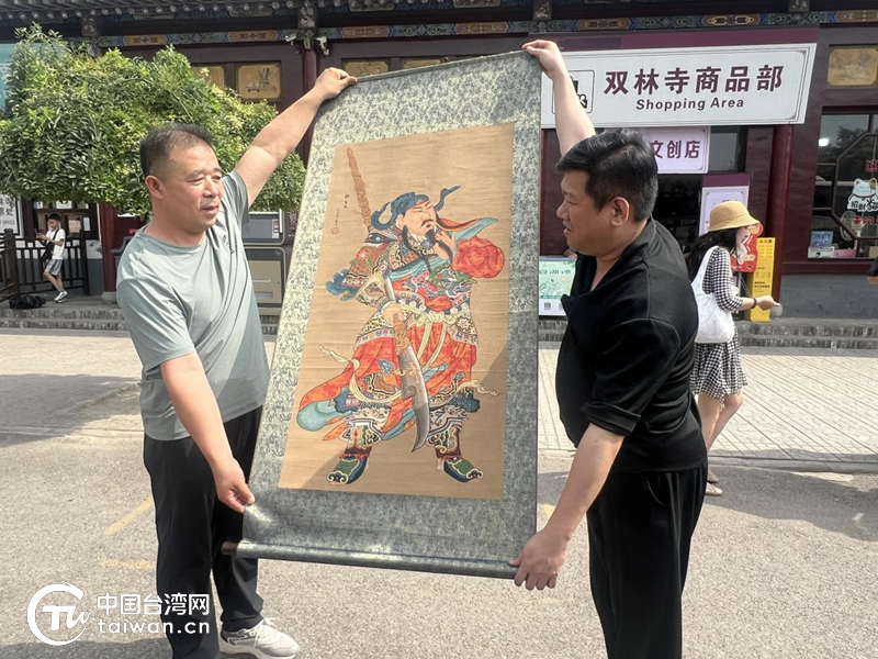 7月25日,在双林寺,画家程永昌将自己精心绘制的手工布画送给台湾青年李东宪。(中国台湾网记者 孙路路 摄)