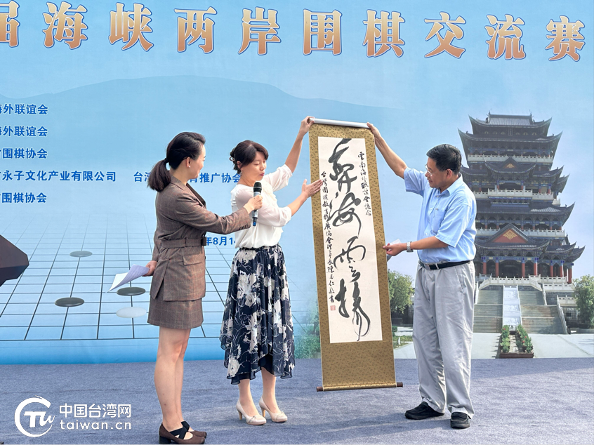 台湾参赛队向云南参赛队赠送“弈海云扬”书法(中国台湾网记者 叶春禄 摄)