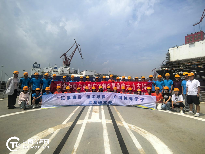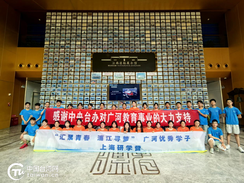 学生们在江南造船展示馆合影留念。(中国台湾网记者 曹帅兵 摄)