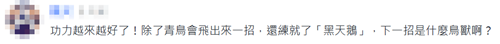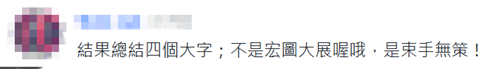 还有人嘲讽说,“什么时候恢复十讲?我想笑”“结果总结四个大字,不是宏图大展喔哦,是束手无策!”“功力越来越好了!除了青鸟会飞出来一招,还练就了‘黑天鹅’,下一招是什么鸟兽啊?”。