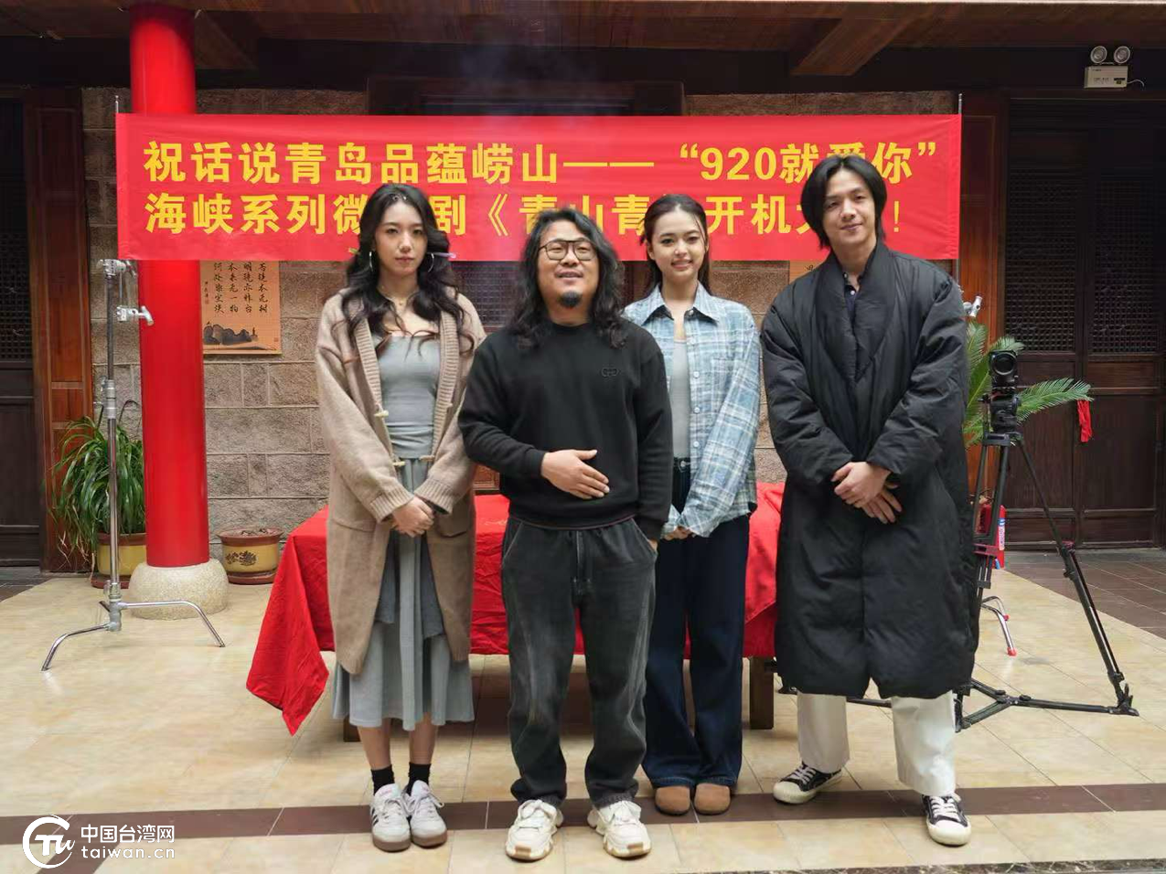 话说青岛品蕴崂山——“920就爱你”海峡系列微短剧《青山青》主创合影。(中国台湾网记者 曹海铮 摄)