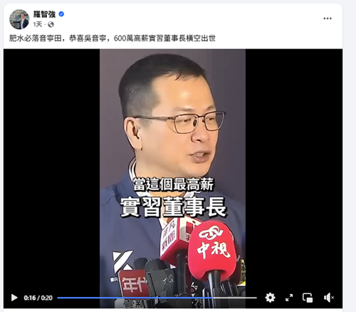 而台湾网友也纷纷讽刺,“颜色真的比什么都来的重要!”“酬庸专门户吗?”“诈骗党的肥水不落外人田!油水肥缺只留给自己人和自家人!”针对吴音宁在事后发文称“政治的口水是一时的”,有网友辛辣讽刺,“政治酬庸是一世的,有党证真好!”(文/文方)