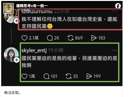 社交平台上,有“青鸟”网民直呼“我不理解任何人在知道台湾史后,还能支持国民党?”,遭到网友神吐槽:“国民党压迫的是我的祖辈,民进党压迫的是我啊!”引发热议。