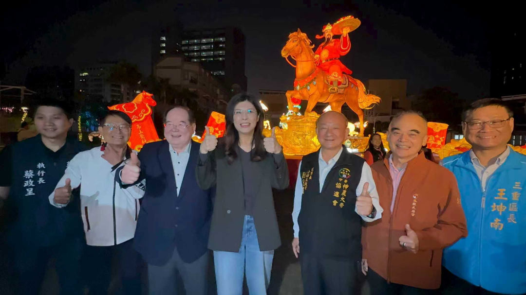 中国国民党主席郑丽文等在《马上发财》灯组前合影(中国台湾网发)