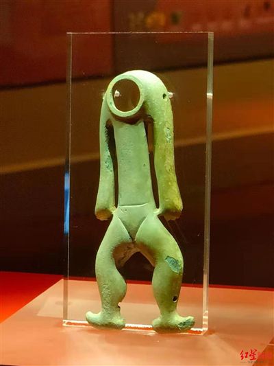 该铜人形器属青铜质,长4.54厘米,宽1.37厘米,高10.35厘米,只有巴掌大,整体形状如一个直立人。“你看,整个造型,四肢躯干都齐全,就是没有人头,反而在人头的位置用一个夸张的圆孔进行替代。这个圆孔我们今天来看,就很像是太空服。”姚凯说。