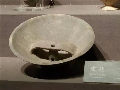 在陈列馆“远古家园”展厅中,有一堆陶器,其中有一个只写着“陶盆”二字的陶器吸引了记者的注意。“这个陶盆,我们没有找到任何历史记载,造型也很特别,根本无从考究它的作用。”随着姚凯手指指引,记者看到,陶盆正中间呈圆柱形,前后各一个小孔,圆柱顶端有一个衡梁,正中也有一个小孔,三个孔互相相通。