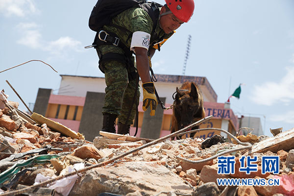 9月9日,在墨西哥瓦哈卡州胡奇坦,搜救人员和搜救犬在房屋废墟上进行搜救。根据墨西哥政府发布的最新数据,截至9日晚,墨西哥地震遇难人数已上升至90人。墨西哥军方和国防部开始向受灾最严重的瓦哈卡州胡奇坦增派救援人员,为当地民众提供人道援助。新华社记者淡航摄