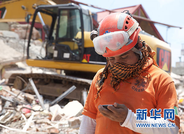 9月9日,在墨西哥瓦哈卡州胡奇坦,一名搜救人员在搜救工作间隙查看手机。根据墨西哥政府发布的最新数据,截至9日晚,墨西哥地震遇难人数已上升至90人。墨西哥军方和国防部开始向受灾最严重的瓦哈卡州胡奇坦增派救援人员,为当地民众提供人道援助。新华社记者淡航摄