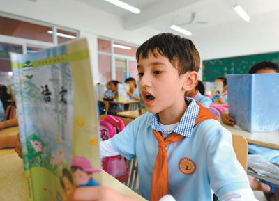 图为9月13日,在安徽省合肥市蚌埠路第二小学,德国籍小学生正在用普通话朗读课文。