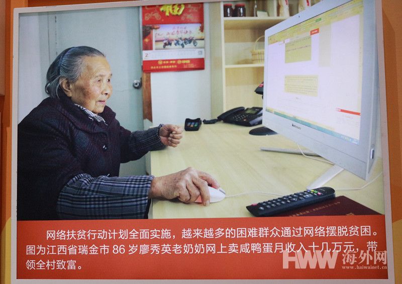 今年86岁的廖秀英老奶奶是咸鸭蛋腌制手艺人,也是位不折不扣的网络达人。文化建设展区的墙上,有一副廖奶奶认真操作电脑的照片,非常醒目。从事医护工作的罗女士说,老人上网就很少见,而八旬老人靠网上卖咸鸭蛋“月收入十几万元”,简直是难以置信!