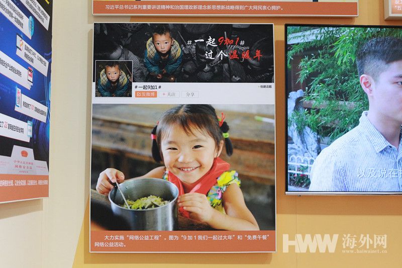 在展区一角,写有“#一起9+1# 一起过个温暖年”的照片吸引了许多观众。这是2016年春节期间,中央网信办指导、中国互联网发展基金会联合新浪微博、贵州网信办、贵州扶贫办、河北网信办、中信银行等开展的“9+1我们一起过大年”精准扶贫公益活动,以互联网的全新思维掀起了一场“去中介化”的网络公益热潮。当时,四川大凉山大眼睛男孩曲比阿萨的照片一经微博发出,便打动无数网友。