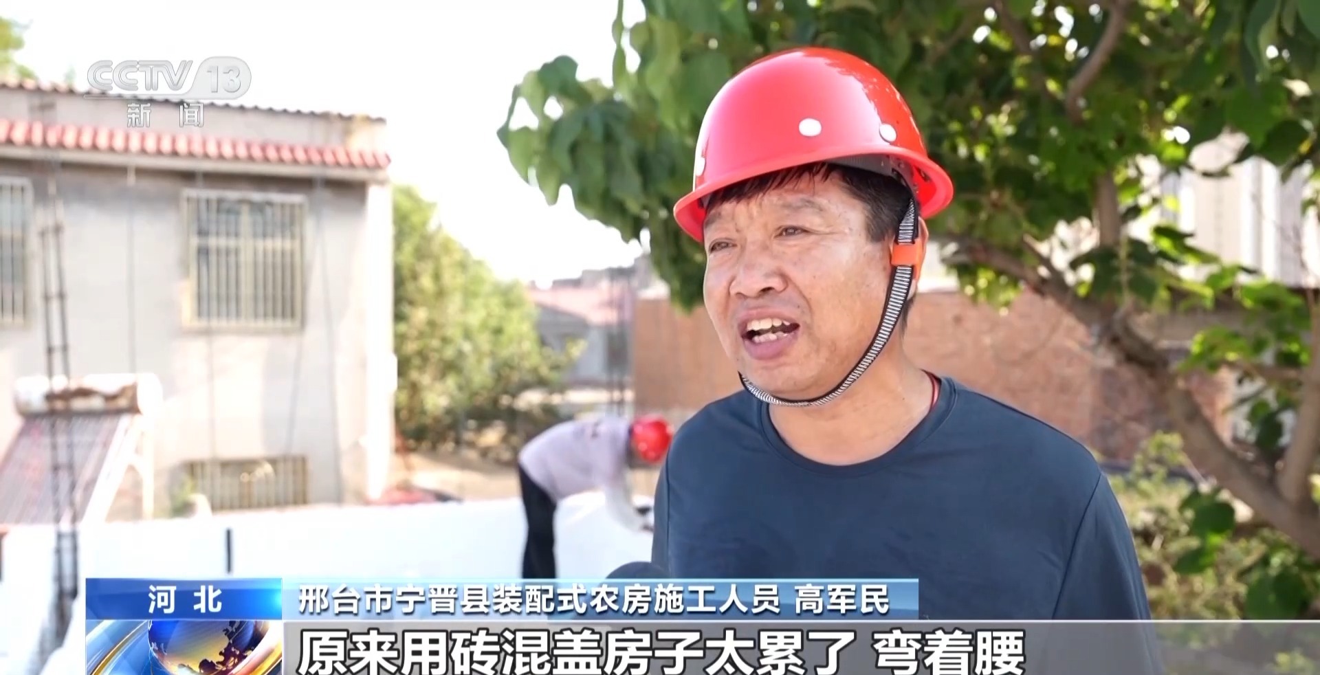 邢台市宁晋县装配式农房施工人员 高军民:原来用砖混盖房子太累了,弯着腰,现在咱们盖房子快、干净,一层一层垛起来,一层30公分,特别快。