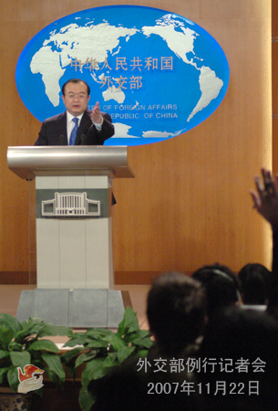 2007年11月22日,外交部发言人刘建超举行例行记者会,就中印联合军事训练、中东问题国际会议、达尔富尔问题、气候变化等答记者问。