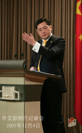 2007年12月4日,外交部发言人秦刚举行例行记者会,就朝核、伊核、俄国家杜马选举、中美战略经济对话、中德关系等问题回答记者提问。
