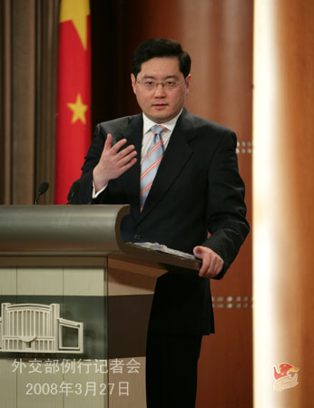2008年3月27日下午,外交部发言人秦刚举行例行记者会,就近期拉萨发生的打砸抢烧严重暴力犯罪事件和部分西方媒体歪曲、虚假报道等问题答问。