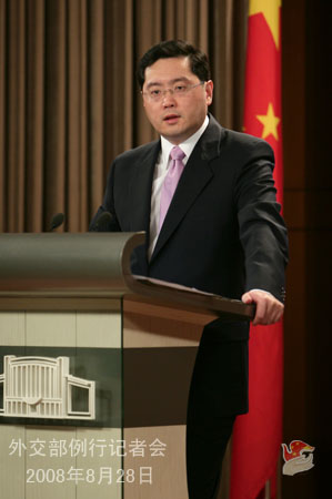 2008年8月28日下午,外交部发言人秦刚举行例行记者会,就六方会谈、上海合作组织杜尚别峰会、南奥塞梯和阿布哈兹局势、极少数国家提出所谓“台湾参与联合国专门机构活动”提案等答问。