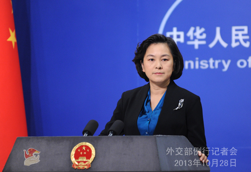 2013年10月28日,外交部发言人华春莹主持例行记者会。