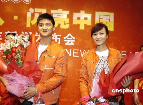 资料图:“跳水王子”田亮与“超级女声”叶一茜的牵手,使他们成为焦点。4月28日,二人出现在苏州,为某情侣装品牌做形象代言人,正式宣布进军娱乐圈。 中新社发 董鸿景 摄