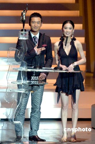 资料图:4月15日晚,第二十六届香港电影金像奖颁奖典礼正在香港文化中心举行,内地影星黄晓明、黄圣依出席颁奖典礼晚会并担任颁奖嘉宾。中新社发 邓庆乐 摄