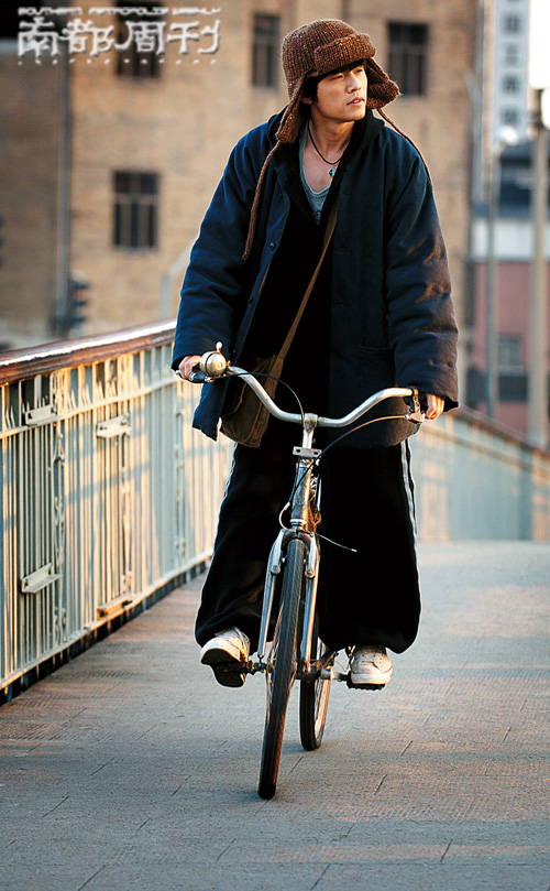 上图:头戴雷锋帽,身穿旧棉袄,脚踏自行车。
