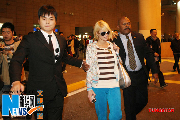 希尔顿乘坐的航班原定应于昨日18时半抵达浦东机场,因种种原因而延误到昨日19时20分左右抵达。几分钟后,希尔顿与六七名随行人员出现在到达大厅。只见这位金发女郎身着彩色卡通衫、湖蓝色长裤,脚踩白色球鞋,戴着金边蛤蟆镜。一名MTV的工作人员在她身边全程拍摄,据悉这一切将被剪辑成一个希尔顿在上海的30分钟短片。在等候行李的时间里,希尔顿并没闲着,一直在把玩自己的手机。很快,取好行李的一行人从空乘人员的专用通道走出,在场记者立即一拥而上,而希尔顿面带微笑,友好地停下摆POSE任由拍摄。面对各路媒体抛出的问题,她耐心地一一作答,谈及对于上海的第一印象,她兴奋地表示:“第一次来中国非常开心,上海是座美丽的城市。”她表示自己对此次上海之行充满期待,“除了参加超级盛典以外,我会利用闲暇时间在上海好好游玩一下。”